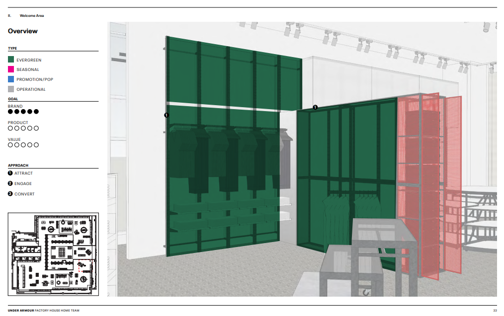 Document communication guidelines for the internal Under Armour team. These guidelines will serve as an “instruction” manual for the placement and purpose of every element inside a North American Factory House outlet store location.